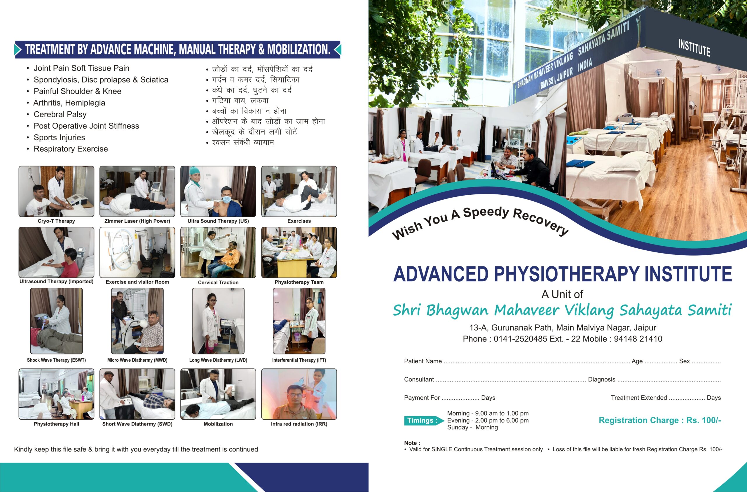 BMVSS has a well-equipped physiotherapy centre at its Jaipur headquarters with modern equipment and highly trained staff. The centre has state-of-the-art machines to improve strength and movement and reduce spasm and swelling.